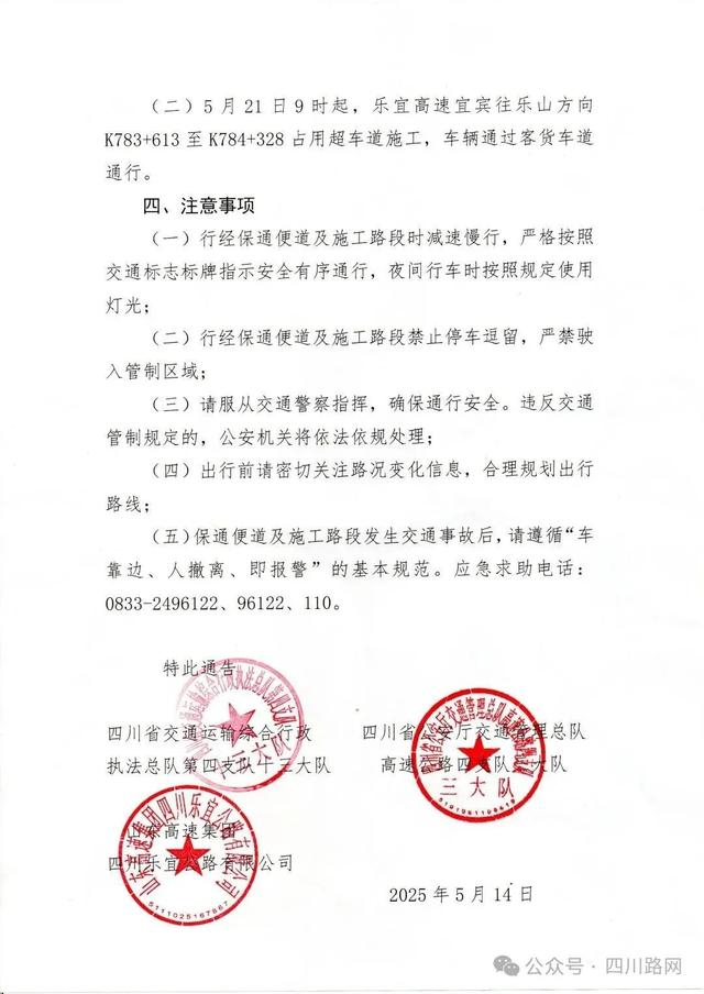 (二)5月21日9时起,乐宜高速宜宾往乐山方向K783+613至K784+328占用超车道施工,预计施工时间十天。
