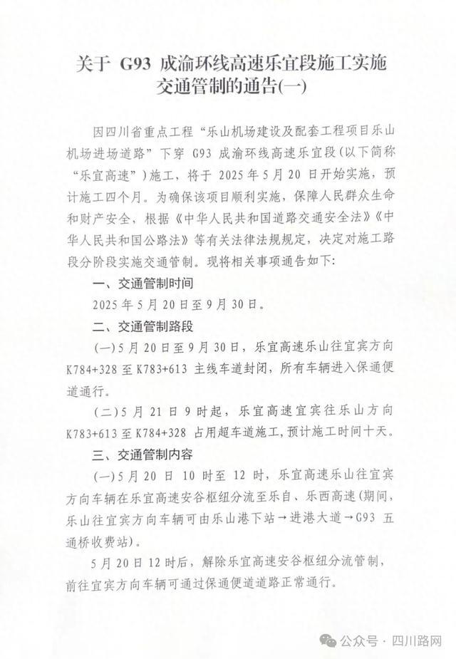 因四川省重点工程“乐山机场建设及配套工程项目乐山机场进场道路”下穿G93成渝环线高速乐宜段(以下简称“乐宜高速”)施工,将于2025年5月20日开始实施,预计施工四个月。为确保该项目顺利实施,保障人民群众生命和财产安全,根据《中华人民共和国道路交通安全法》《中华人民共和国公路法》等有关法律法规规定,决定对施工路段分阶段实施交通管制。现将相关事项通告如下: