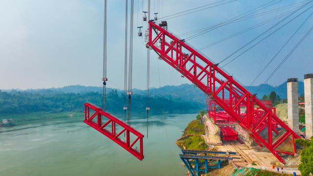 建设过程中,创新技术成为破局关键。镇广高速控制性工程白马渠江特大桥全长657.8米,主桥以390米净跨一跨过江,建设者创新工艺工法,通过缆索吊装系统实现钢结构90度或180度空中翻身,完成大吨位拱肋节段吊装;自主研发的“桥梁支座垫石及橡胶支座受力均衡性无人机测量技术”,实现了巨大的桥梁建造期非接触、高精度测量,一举斩获2024年“全国公路微创新大赛金奖”。