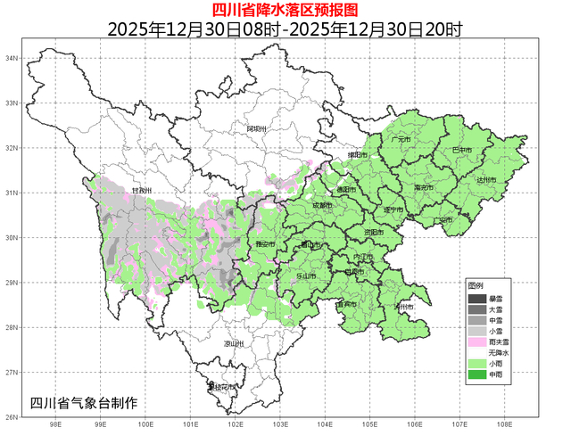 30日,四川盆地各市阴天有小雨,其中达州、巴中、南充、广安、遂宁、资阳、泸州7市和广元、内江2市东部有中雨,高海拔山区有雨夹雪或小雪;甘孜州中部南部、阿坝州东部南部和凉山州北部阴天间多云,有阵雪(雨),局部中到大雪,川西高原和攀西其他地区多云转晴。