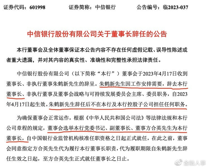 4月17日,中信银行公告,朱鹤新先生因工作安排需要,辞去本行董事长、非执行董事及董事会战略与可持续发展委员会主席、委员职务。原行长方合英将出任公司董事长职务,原副行长刘成将出任行长职务,两人将在获得中国银行监管机构核准后正式就任。