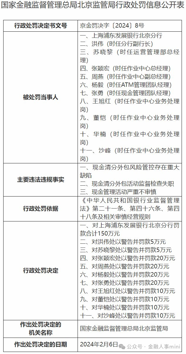 2月18日,国家金融监督管理总局北京监管局行政处罚信息公开表披露,上海浦东发展银行北京分行因违法违规事实被罚款合计150万元。
