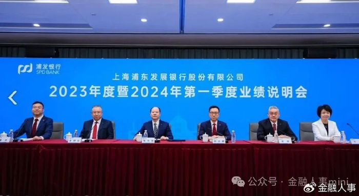 4月30日上午,浦发银行召开2023年度暨2024年第一季度业绩说明会,出席说明会的核心管理团队成员有,去年刚上任的董事长张为忠(下图左三),执行董事、副行长(主持经营工作)兼首席风险官刘以研(右三),副行长兼董事会秘书谢伟(右二),从2016年起就出任副行长的崔炳文(左二),去年9月从上海市国资委调任浦发银行的副行长康杰(左一),以及时任党委委员的丁蔚(右一)。