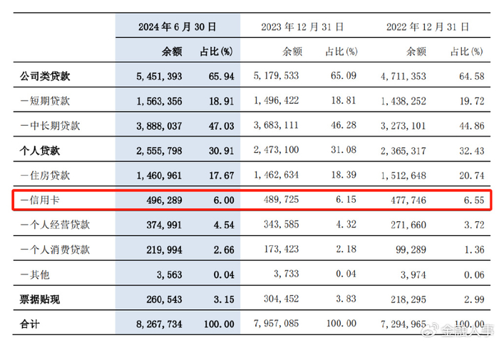 截至2024年6月末,交行境内信用卡在册卡量 6,488.83 万张,相较于2023年末的7,132.42 万张,减少643.59万张。截至2024年6月末,交行信用卡贷款余额4962.89亿元,较上年末增加 65.64 亿元,增幅1.34%;但从总体看,信用卡贷款总占比从上年末的6.15%,下降至6%。