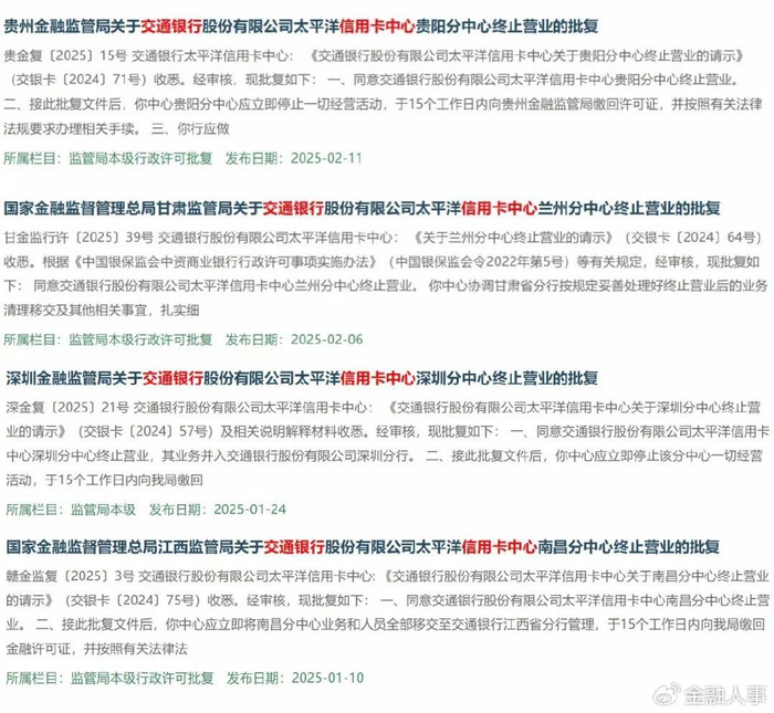人事变动之外,交通银行信用卡业务也出现大范围调整。据金融监管总局批复信息显示,2025年以来,交通银行太平洋信用卡中心南昌分中心、深圳分中心、兰州分中心、贵阳分中心相继终止营业。