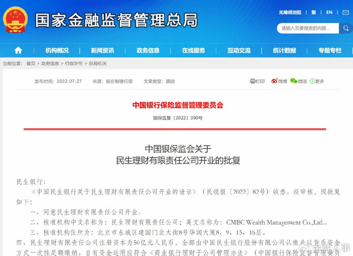 2022年7月27日,银保监会网站发布《关于民生理财有限责任公司开业的批复》,同意民生理财开业。