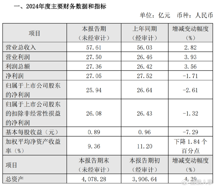 业绩方面,2024年,厦门银行实现营业收入57.61亿元,同比增长2.82%;实现净利润 27.05 亿元,同比下降1.71%;归属于上市公司股东的净利润25.94亿元,同比下降2.61%,净资产收益率为9.36%,同比下滑1.84个百分点。