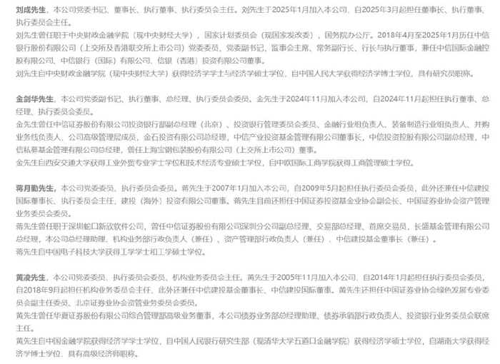 查询中信建投官网,新领导班子里,中信建投党委成员有党委书记、董事长刘成,党委副书记、总经理金剑华,党委委员、执行委员会委员蒋月勤,党委委员、执行委员会会员、机构业务委员会主任黄凌。
