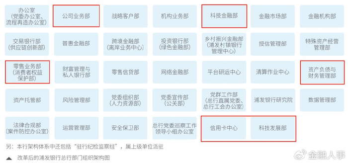 浦发银行董事长张为忠在2024年年报致辞中表示,“全面调优组织架构,以基层为起点,从客户出发,增强前台力量,集约集成中后台,设立新质生产力部门,构建‘前哨强、中台智、后台精’的敏捷组织体系。”