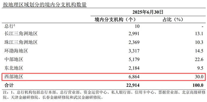 按经营区域划分,截至6月末,农行在西部地区有6864个分支机构,占全行的比重最高,达到30%;有员工115,843人,也是全行员工最多的地区,占比26%。