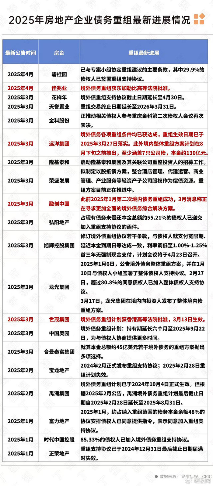 4月22日,根据克而瑞研究中心数据显示,2025年一季度以来,中国房地产行业债务重组工作取得显著进展。据最新统计数据显示,包括碧桂园、远洋集团、世茂集团等在内的十余家头部房企密集披露债务重组最新动态,标志着行业风险化解进入实质性操作阶段。
