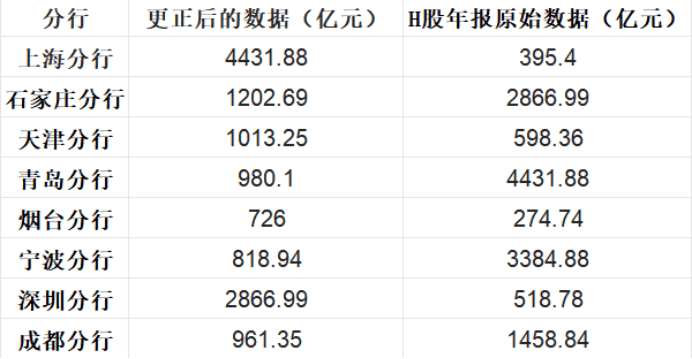 最典型的案例是上海分行。在A股修正版年报中,上海分行资产规模为4431.88亿元;而在H股原始版年报中,这一数据变成了395.40亿元,两者相差4036.48亿元,A股数据是H股的约11倍。