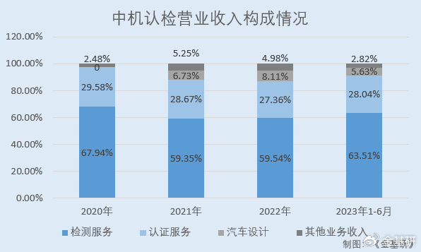 2020-2022年及2023年1-6月,中机认检的检测服务收入分别为2.92亿元、3.18亿元、3.80亿元、2.32亿元,占营业收入的比例分别为67.94%、59.35%、59.54%、63.51%。