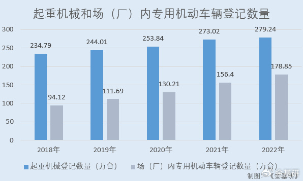 据国家市场监管总局数据,2018-2022年,国内起重机械登记数量分别为234.79万台、244.01万台、253.84万台、273.02万台、279.24万台;场(厂)内专用机动车辆登记数量分别为94.12万台、111.69万台、130.21万台、156.40万台、178.85万台,均呈增长趋势。