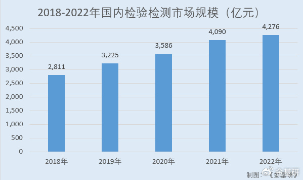 据国家市场监管总局、中商产业研究院数据,2018-2022年,国内检验检测市场规模分别为2,811亿元、3,225亿元、3,586亿元、4,090亿元、4,276亿元,年均复合增长率为11.06%。