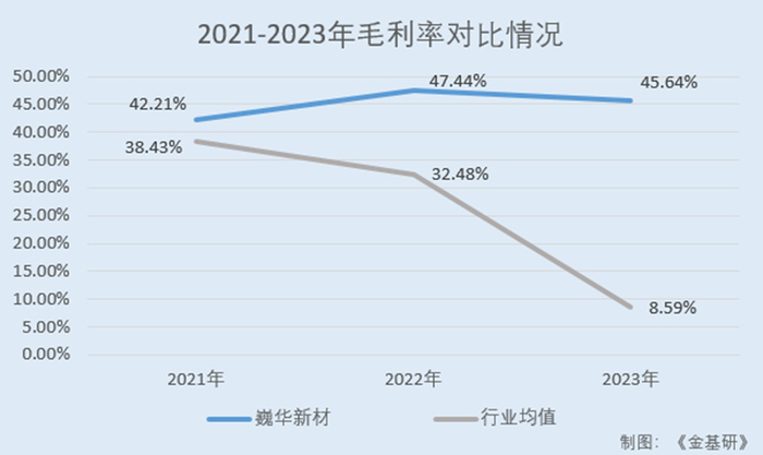 据招股书,2021-2023年,巍华新材毛利率分别为42.21%、47.44%、45.64%。