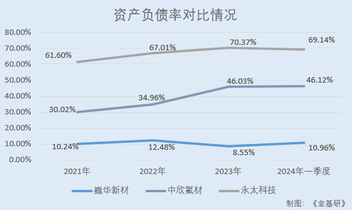 2021-2023年及2024年1-3月,巍华新材的资产负债率分别为10.24%、12.48%、8.55%、10.96%;中欣氟材的资产负债率分别为30.02%、34.96%、46.03%、46.12%;永太科技的资产负债率分别为61.60%、67.01%、70.37%、69.14%。