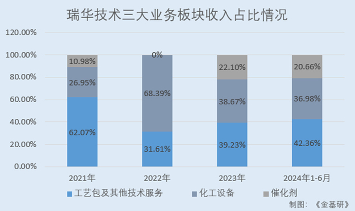 2021-2023年及2024年1-6月,瑞华技术工艺包及其他技术服务收入占主营业务收入的比例分别为62.07%、31.61%、39.23%、42.36%;化工设备收入占主营业务收入的比例分别为26.95%、68.39%、38.67%、36.98%;催化剂收入占主营业务收入的比例分别为10.98%、0%、22.10%、20.66%。