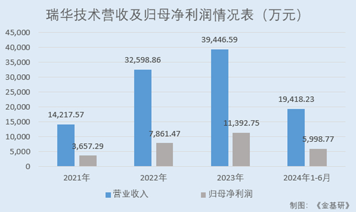 据招股书及定期报告,2021-2023年及2024年1-6月,瑞华技术的营业收入分别为1.42亿元、3.26亿元、3.94亿元、1.94亿元;归母净利润分别为3,657.29万元、7,861.47万元、11,392.75万元、5,998.77万元。