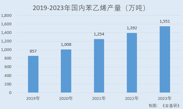 据观研天下数据,2019-2023年,国内苯乙烯产量分别为857万吨、1,008万吨、1,254万吨、1,392万吨、1,551万吨。
