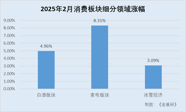 随着国内经济逐步复苏和消费场景的恢复,消费板块成为市场关注的焦点之一。根据Wind数据,2025年2月至3月,消费板块整体表现稳健,尤其是白酒、家电等传统消费领域以及冰雪经济等新兴消费领域表现亮眼。