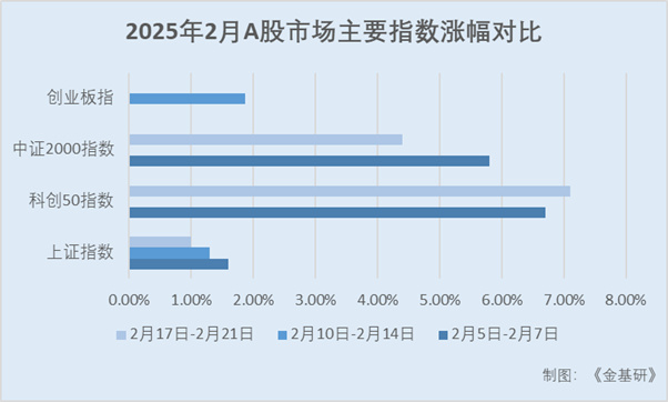 进入 2 月 17 日至 2 月 21 日这一周,上证指数继续保持上涨势头,涨幅为 1.0%。全市场的日均成交额进一步走高,接近 2 万亿元,市场情绪进一步升温。在结构上,科技股和小盘股的弹性依然较大,科创 50 指数上涨 7.1%,中证 2000 指数上涨 4.4%,这两个指数的表现再次成为市场关注的焦点。