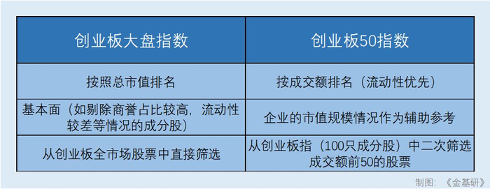 即是说,在选择样本的指标上,创业板50指数选股逻辑是按照成交额排名(流动性优先),市值规模作为辅助;创业板大盘指数则按照总市值排名,根据基本面信息(如商誉占比)进行成分股的选择。