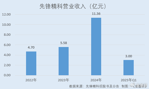 据先锋精科招股书及2024年年报数据,2022-2024年,先锋精科的营业收入分别为4.70亿元、5.58亿元、11.36亿元,年均复合增长率达55.50%;归母净利润分别为1.05亿元、0.80亿元、2.14亿元,年均复合增长率为42.89%。
