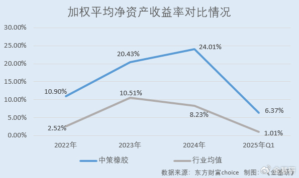 据东方财富choice数据,2022-2024年及2025年1-3月,中策橡胶的ROE分别为10.90%、20.43%、24.01%、6.37%。