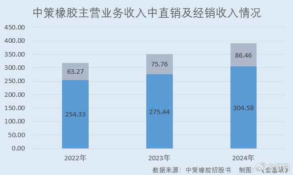 2022-2024年,中策橡胶经销模式主营业务收入金额分别为254.33亿元、275.44亿元、304.58亿元,呈稳步增长趋势。