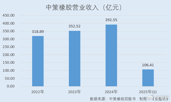据招股书,2022-2024年及2025年一季度,中策橡胶实现营业收入分别为318.89亿元、352.52亿元、392.55亿元、106.41亿元,2022-2024年CAGR为10.95%。需要说明的是,中策橡胶2025年一季度财务数据经天健会计师事务所审阅未审计,下同。