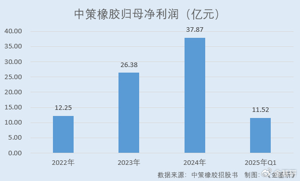 同期,中策橡胶的归母净利润分别为12.25亿元、26.38亿元、37.87亿元、11.52亿元,2022-2024年CAGR达75.84%。