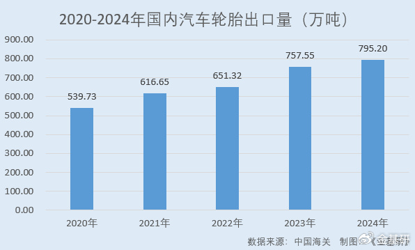 据中国海关数据,2020-2024年,国内汽车轮胎出口量分别为539.23万吨、616.65万吨、651.32万吨、757.55万吨、795.20万吨。
