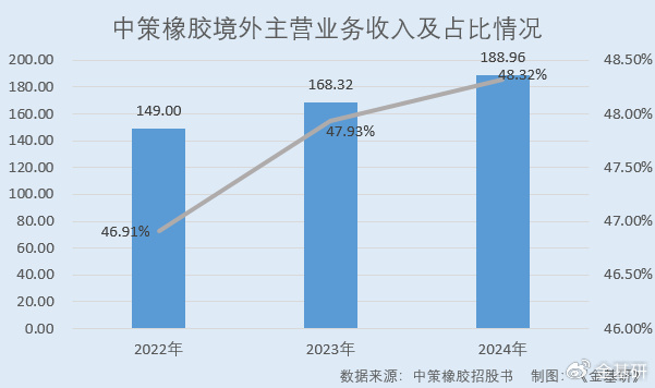 据招股书,2022-2024年,中策橡胶境外主营业务收入分别为149.00亿元、168.32亿元、188.96亿元,占当期主营业务收入的比例分别为46.91%、47.93%、48.32%。
