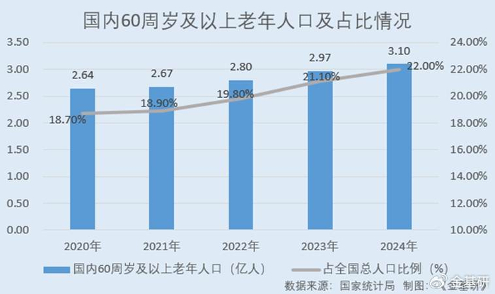 深入探究步长制药业绩韧性的根源,必须置于国内社会深刻的人口结构变迁之中。根据国家统计局数据,2020-2024年,国内60周岁及以上人口分别为2.64亿人、2.67亿人、2.80亿人、2.97亿人、3.10亿人,占全国人口的比例分别为18.7%、18.9%、19.8%、21.1%、22.0%,社会老龄化程度日益加深。