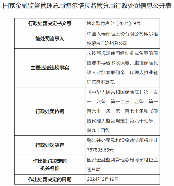 国家金融监管总局发布的处罚通告显示,中国人寿新疆博尔塔拉蒙古自治州分公司未按照规定使用经批准或备案的保险费率导致多收保费、虚挂保险代理人业务套取佣金、代理人执业登记信息不真实,被罚款和没收违法所得共计787835.68元。