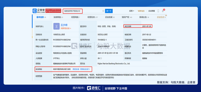 企查查显示,宝锋电子全称福建宝锋电子有限公司,成立于2001年7月,王少峰全资持有,企业地址:南安市霞美镇长福工业区 。除了一家控股子公司泉州市俱进电子科技有限公司外,无其他对外投资,亦无境外投资。