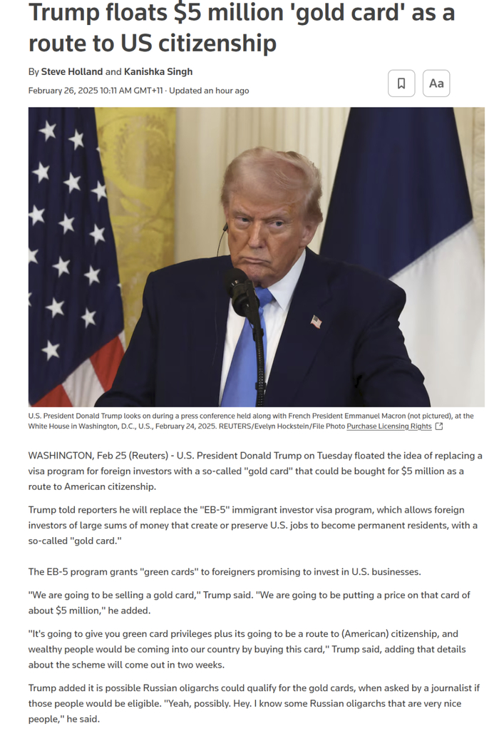 特朗普宣布,发行500万美元起一张的金卡,规格高于绿卡,用于取代EB-5项目。