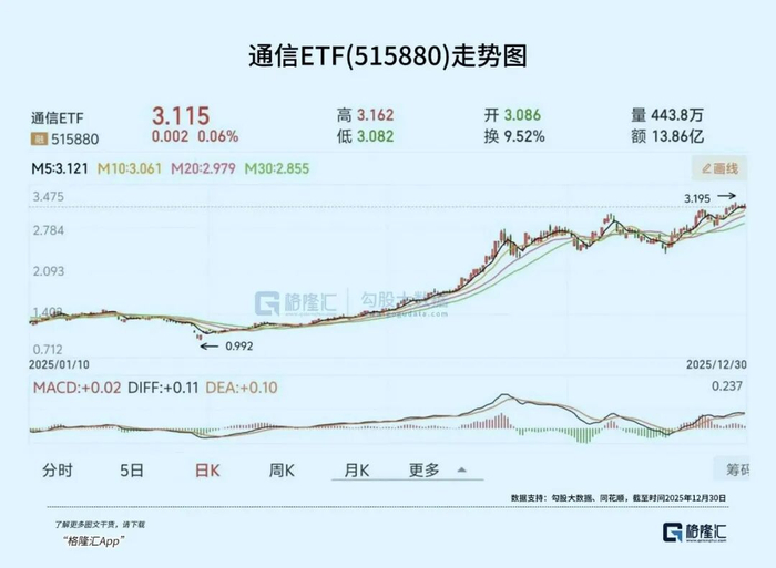 其中,通信ETF(515880)收涨,年内涨幅达到128.37%,全市场 ETF 涨幅第一,录得三年连涨,累计涨幅高达278.49%。