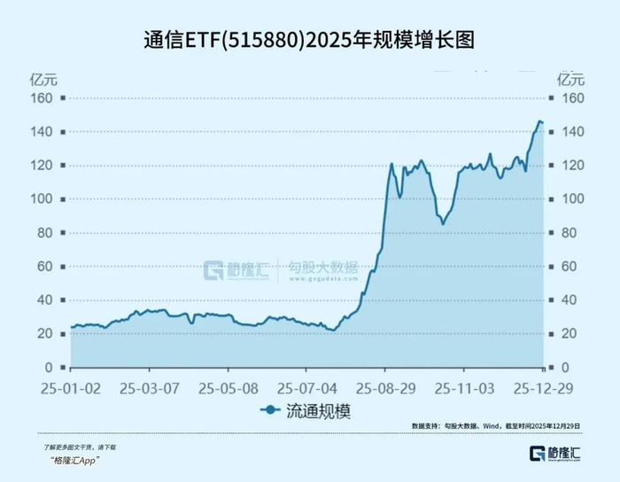 在上涨中,资金持续净买入。Wind数据显示,截至12月29日,通信ETF(515880)年内净流入达72.24亿元,规模较年初飙涨486.5%至145.17亿元,居同类首位。