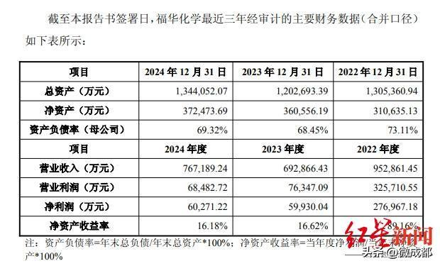 据《详式权益变动报告书》,2022年至2024年,福华化学的营收分别为95.29亿元、69.29亿元、76.72亿元;净利润分别为27.70亿元、6.00亿元、6.03亿元。截至2024年12月31日,福华化学总资产为134.41亿元,净资产为37.25亿元,母公司资产负债率为69.32%。