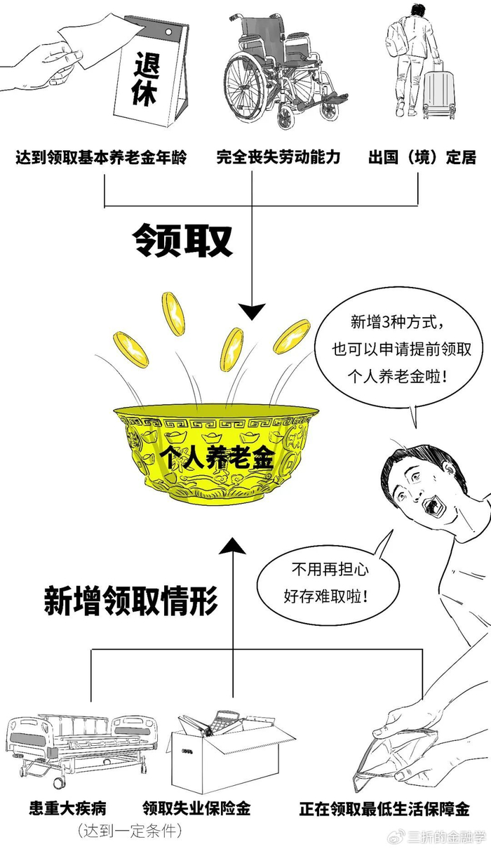原先规定只有当参加人达到领取基本养老金年龄、完全丧失劳动能力、出国(境)定居时,才能领取个人养老金,后续又新增了3种提前领取的情形,满足更多需求。