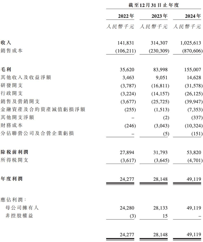 2022年、2023年和2024年,果下科技的收入分别约为1.42亿元、3.14亿元和10.26亿元,毛利分别约为3562.0万元、8399.8万元和1.55亿元,净利润分别为2427.7万元、2814.8万元和4911.9万元。