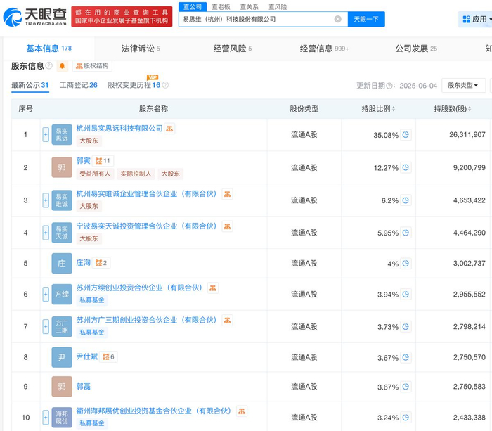 天眼查App信息显示,易思维成立于2017年12月,位于浙江省杭州市。目前,该公司的注册资本为7500万元,法定代表人为郭寅,主要股东包括杭州易实思远科技有限公司(下称“易实思远”)、郭寅等。