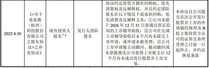 但2025年4月,易思维再度签署协议,解除了前述条款。同时,约定了恢复条款,包括:公司公开发行股票并上市的申请撤回,或被否,或市保荐人撤回保荐;以及,注册获准但未能在有效期(12个月内)上市。