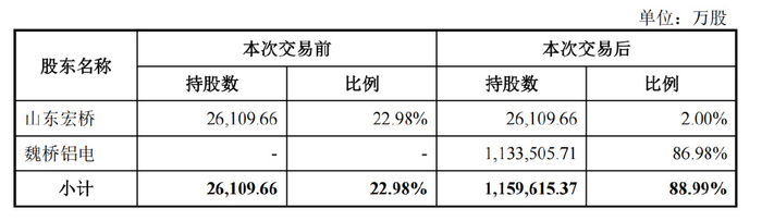 交易完成后,魏桥铝电持股比例从22.98%升至86.98%,成为控股股东,原控股股东山东宏桥的持股比例降至2%。