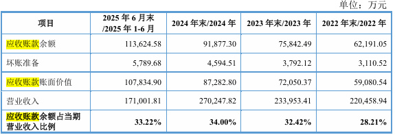 报告期各期末,公司应收账款余额分别为6.22亿元、7.58亿元、9.19亿元和11.36亿元,占营业收入比例分别为28.21%、32.42%、34%和33.22%。报告期各期,公司应收账款周转率为3.19次、3.39次、3.22次和1.66次,同行业可比公司的平均值分别为3.61次、3.46次、3.77次、2.00次。