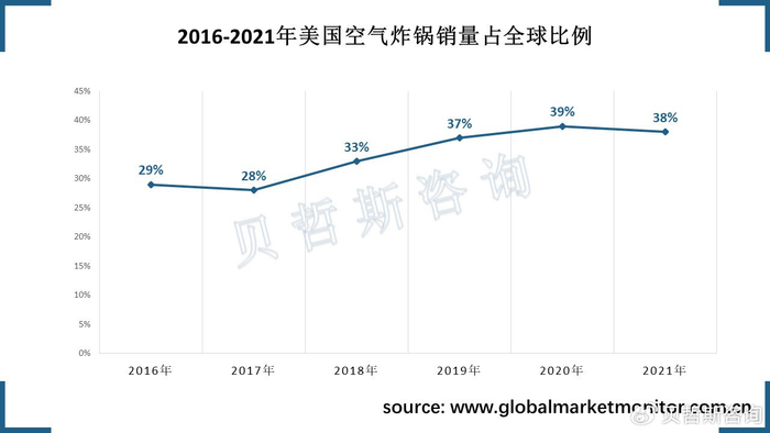 空气炸锅诞生美国,中国市场起步较晚。由于欧美国家的消费者以油炸速食为主,大多数主流食物均可用烤箱加热烹制而成,因此兼具炸制加热功能与健康便捷理念的空气炸锅、空气烤箱等产品在快餐文化盛行的欧美市场极受推崇,其销量规模快速增长。美国空气炸锅销量占全球的比重逐步上升,从2016年的29%提升至2021年的38%。