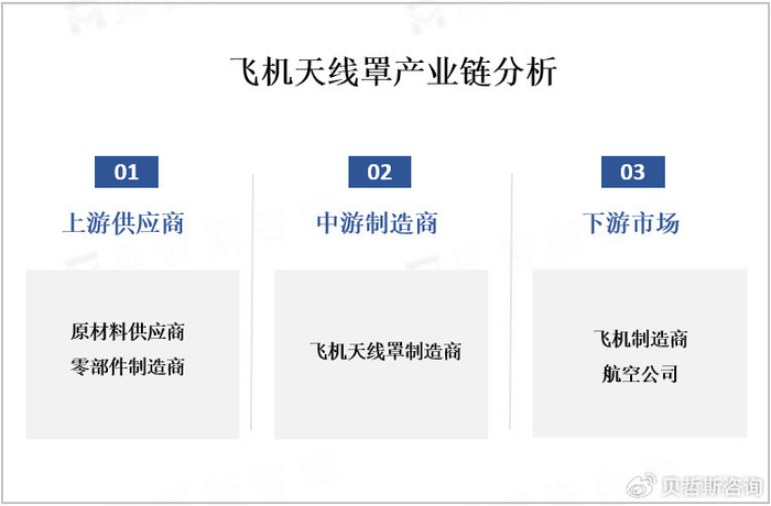 上游:上游环节主要包括原材料供应商和零部件制造商。对于飞机天线罩来说,原材料供应商可能提供复合材料、金属材料等用于制造天线罩的材料。零部件制造商可能负责生产天线罩的组件,如外壳、连接件等。