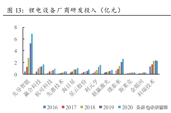 2016-2020 年,行业的整体研发费用率一直维持在 7%—9%之间,处于较高水平。在 研发投入上,先导智能、利元亨、杭可科技等龙头设备企业研发投入逐年增加。先导智 能的研发投入从 2016 年的 0.52 亿元增长到 2020 年的 6.89 亿元,CAGR 达 90.37%。利 元亨的研发投入从 2016 年的 0.23 亿元增长至 2020 年的 1.64 亿元,CAGR 达 64.08%。 杭可科技的研发投入由2016年的0.26亿元增长到2020年的1.04亿元,CAGR达41.02%。龙头设备厂商通过高研发投入帮助自己产品快速迭代,提升产品精度、稳定性及竞争力。